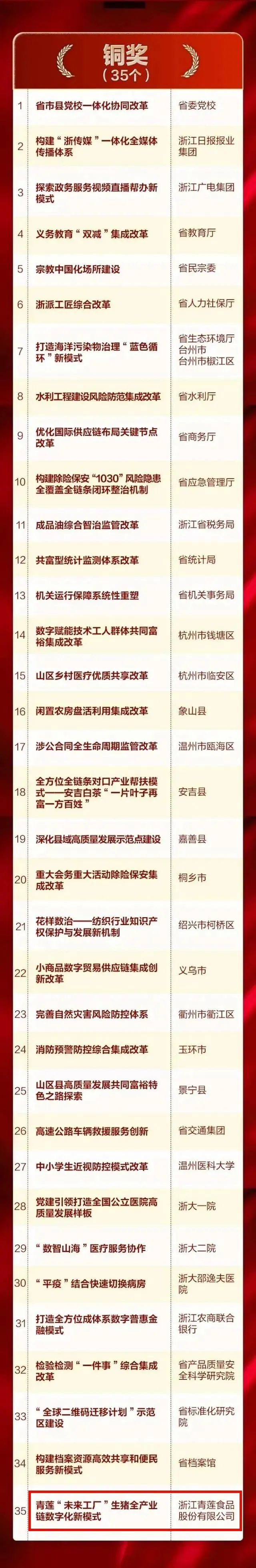 重磅!青蓮食品—膳博士榮獲浙江改革突破獎銅獎! 2023-02-02 08:37:26 浙江青蓮食品股份有限公司 瀏覽次數 6721 近日,浙江省委改革辦公布了2022年度浙江省改革突破獎名單。浙江青蓮食品股份有限公司“數智青蓮”未來工廠榮獲2022年度浙江省改革突破獎銅獎,是銅獎組中唯一的一家民營企業。20多年來,青蓮食品構建起從農場到餐桌的透明全產業鏈,在改革創新中以種業為源頭,建立起未來農場—未來工廠—產業新零售等數字化應用,真正從用戶需求出發為社會提供優質食品!此次獲得浙江改革突破獎銅獎,更是對青蓮食品數字化轉型成果的肯定和勉勵!實現黑豬專家膳博士在安全和美味雙升級上硬核突破!身為黑豬專家,膳博士服務過世博會、世乒賽、國際馬拉松比賽,連續8年為世界互聯網大會供肉,連續14年為中國極地研究中心供肉,成為杭州亞運會官方生鮮肉類產品供應商。以國家級嘉興黑豬和兩頭烏保種場作為種業基礎繁育國家級優質新品種,形成完整的黑豬商品體系為消費者帶來舌尖體驗。近年來,通過智慧養殖為傳統畜牧產業數字化轉型先行探路,以新一代信息技術為手段,重塑生豬全產業鏈生產組織方式和管理服務模式,構建“1+4+N”模型,推動全產業鏈數字化轉型。產業零售端以用戶需求為中心持續推出膳博士黑豬鮮肉鮮制系列產品提升消費體驗,滿足國人對美好生活、品質食品的向往。2022年,青蓮智慧牧場首批入選浙江省“未來農場”,“數智青蓮”未來工廠獲全省數字化改革“最佳應用”和全省數字經濟系統“最佳應用”。在全省數字化改革大會上做匯報演示,列入全省數字經濟系統地方特色應用目錄,受到央視、省級、市縣級等媒體持續關注報道。 上一條“風云浙商”許明曙:人生把一件事做好就很不容易 下一條全國唯一!膳博士·香雪白豬獲2022年度國家新品種認定!